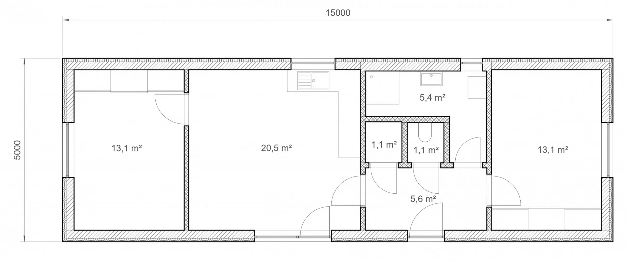 Es kombiniert ein Flachdach mit einer natürlichen Holzverkleidung, was ein angenehmes und rustikales Aussehen ergibt. Mit Abmessungen von bis zu 5 x 15 Metern bietet dieses geräumige Modul nicht nur viel Platz für komfortables Wohnen, sondern eignet sich auch hervorragend für gewerbliche Zwecke wie Cafés, kleine Geschäfte oder Büros.